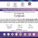 Ms Aishwarya Rao, PhD scholar, Department of Innate Immunity, ICMR-NIRRH, Mumbai for her e-poster entitled, “Total and PLAP+ exosomes from third trimester early onset preeclamptic women enhanced levels of pro-inflammatory and anti-angiogenic markers in healthy non-pregnant PBMCs” at the ISSRF-2021: International Conference on Challenges and Strategies in Reproductive and Environmental Health with Special Reference to COVID-19 Pandemic & 31st Annual Meeting of the Indian Society for the Study of Reproduction and Fertility (ISSRF)