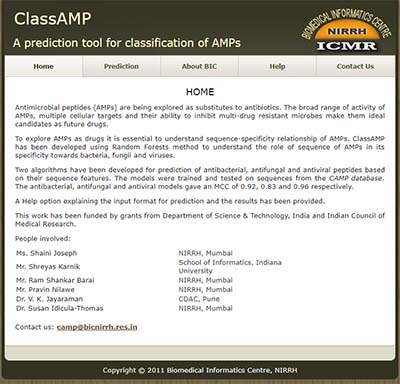 ClassAMP : Antimicrobial peptides (AMPs) are being explored as substitutes to antibiotics. The broad range of activity of AMPs, multiple cellular targets and their ability to inhibit multi-drug resistant microbes make them ideal candidates as future drugs. To explore AMPs as drugs it is essential to understand sequence-specificity relationship of AMPs. ClassAMP has been developed using Random Forests method to understand the role of sequence of AMPs in its specificity towards bacteria, fungii and viruses.