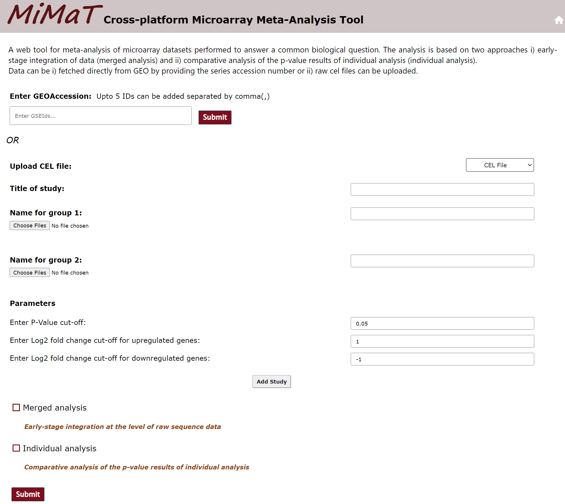 MiMaT – A web tool for meta-analysis of microarray datasets performed to answer a common biological question. The analysis is based on two approaches i) early-stage integration of data (merged analysis) and ii) comparative analysis of the p-value results of individual analysis (individual analysis).